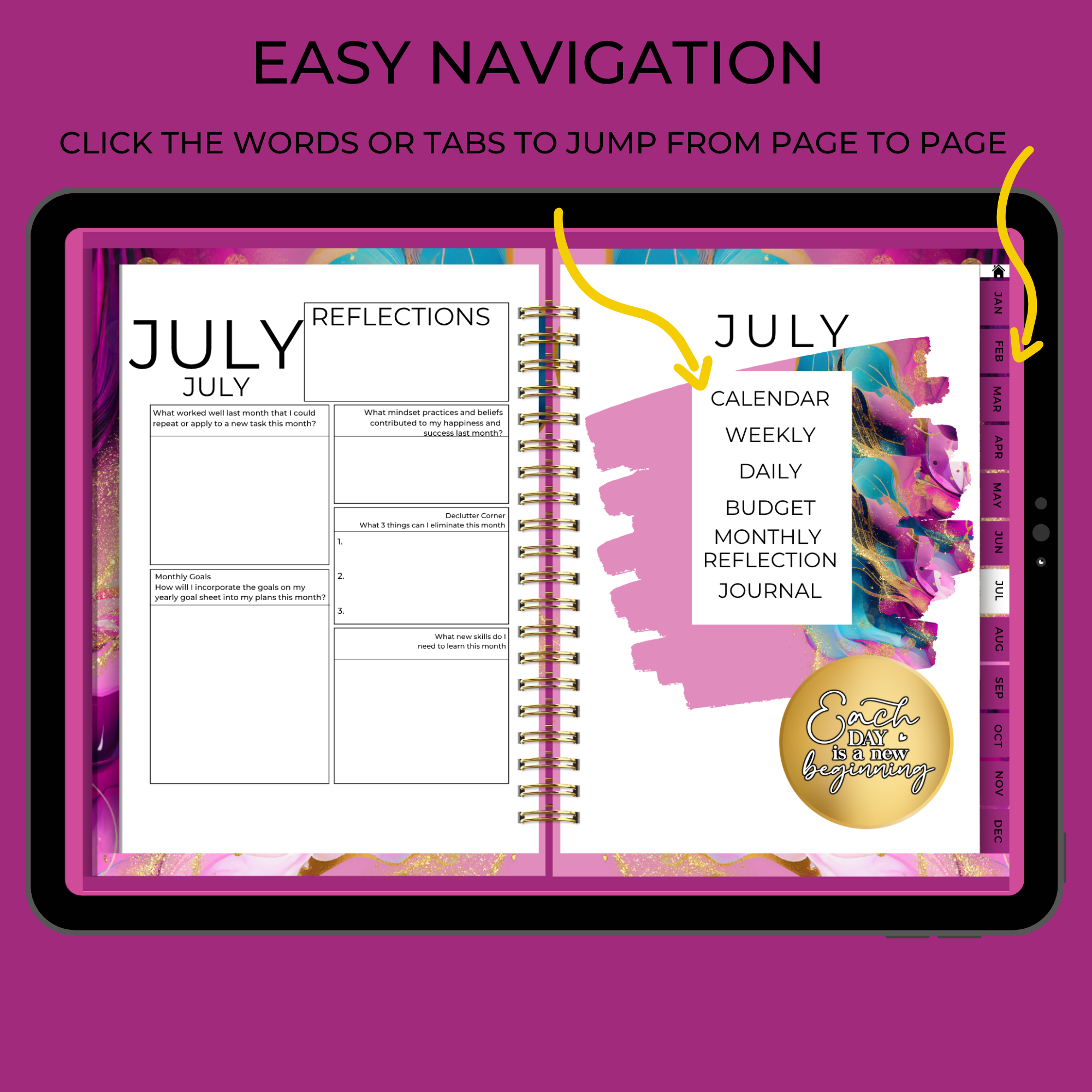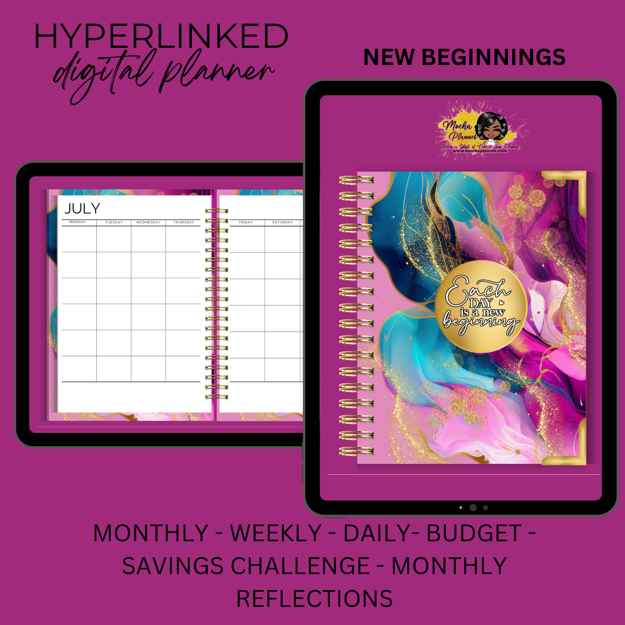 The NEW BEGINNINGS UNDATED DIGITAL PLANNER is here to help you get organized. The functional, yet stylish pages are designed with a clean and modern look. Planner pages have a “Monday” start layout. There are over 780 hyperlinks throughout the planner for effortless navigation.