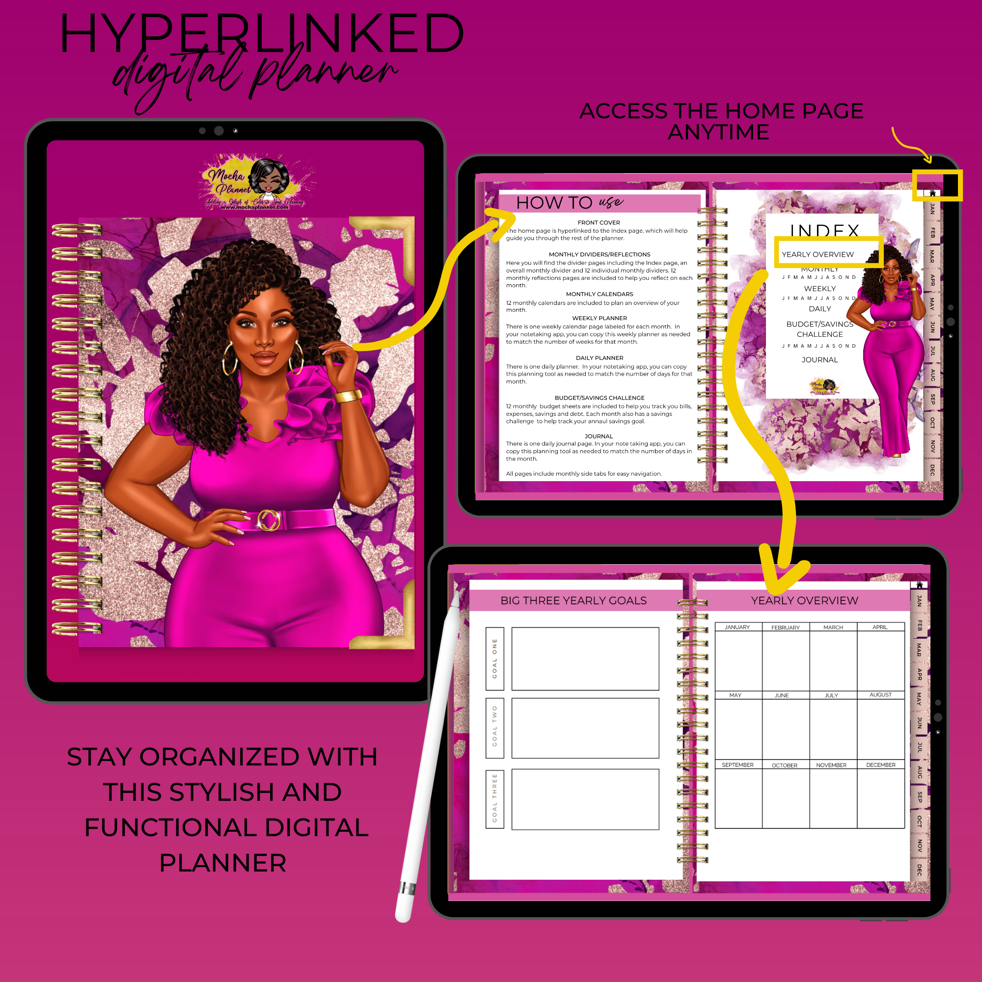 The PRETTY AND PURPOSED UNDATED DIGITAL PLANNER is here to help you get organized. The functional, yet stylish pages are designed with a clean and modern look. Planner pages have a “Monday” start layout. There are over 780 hyperlinks throughout the planner for effortless navigation.